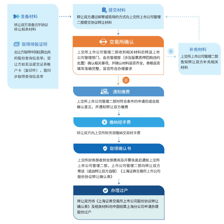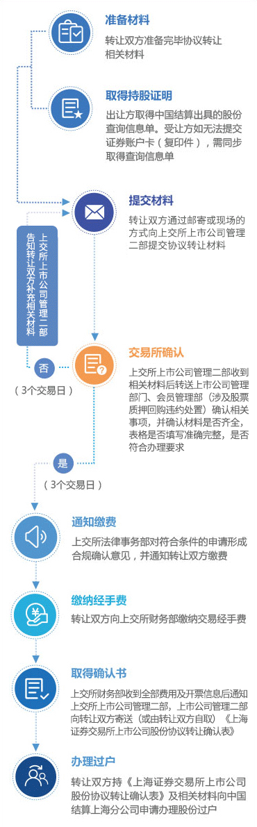本所依據(jù)《上市公司非流通股股份轉讓業(yè)務辦理規(guī)則》《上市公司非流通股股份轉讓業(yè)務辦理實施細則》《上市公司流通股協(xié)議轉讓業(yè)務辦理暫行規(guī)則》及《上海證券交易所上市公司股份協(xié)議轉讓業(yè)務辦理指引》等規(guī)定受理協(xié)議轉讓申請,對轉讓雙方提交的申請文件進行完備性核對,并對符合條件的協(xié)議轉讓出具合規(guī)確認意見。轉讓雙方持合規(guī)確認意見,前往中國證券登記結算有限責任公司辦理股份過戶手續(xù)。